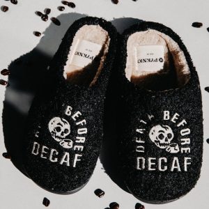 Death Before Decaf Slippers by Pyknic | Comfy, Plush Warm Fleece Slippers for Coffee Lovers, Foodies, Tattoo Art, Coffee Mug